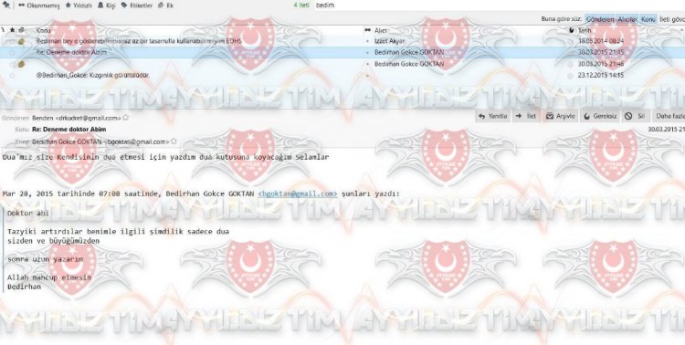 Mail adresi hacklenen Bedirhan Gökçe'nin, terörist başı Fetullah Gülen'in doktoru Kudret Ünal'dan "Tazyiki artırdılar benimle ilgili sadece dua, sizden ve büyüğümüzden sonra uzun yazarım. Allah mahcup etmesin" diyerek dua istediği mail yayınlandı.