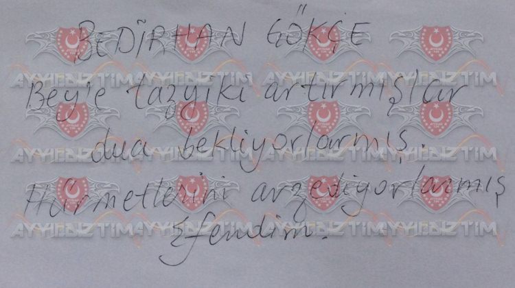 FETÖ'nün doktoru da, "Bedirhan Gökçe Bey'e tazyiki artırmışlar dua bekliyorlarmış. Hizmetlerini arzediyormuşlar efendim" yazılı kağıdı dua kutusuna attığını gösteren bir maille cevap verdi.