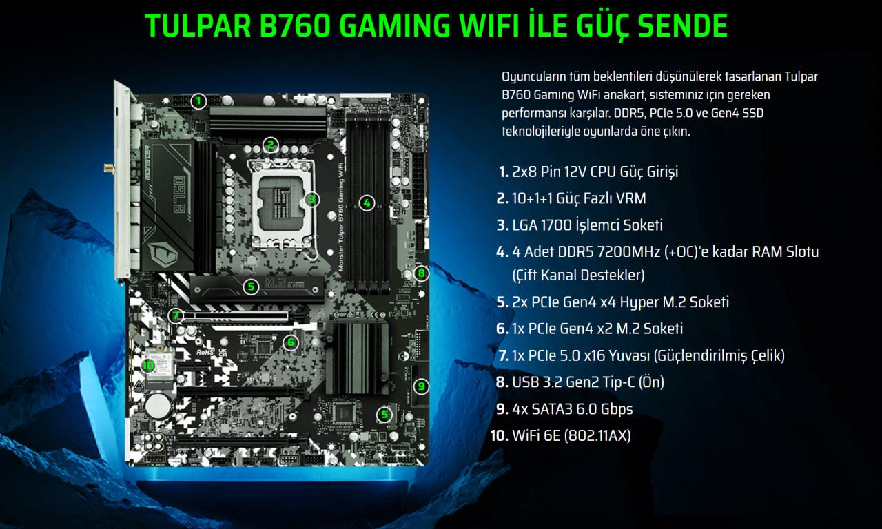 Sistemin merkezinde yer alan Monster B760 Gaming WiFi anakart, modern masaüstü platformdan beklenen tüm özellikleri sunuyor.