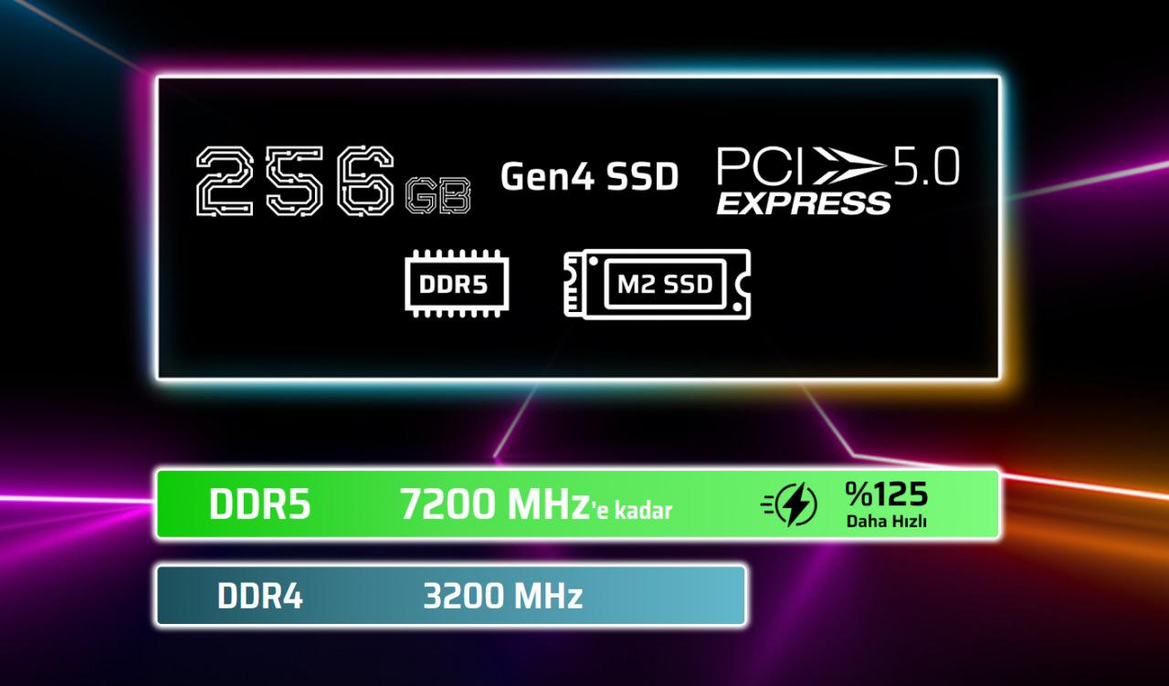 DDR5 7200 MHz (OC) desteği ve PCIe 5.0 x16 ekran kartı yuvası, sistemin ileriye dönük olmasını sağlıyor.