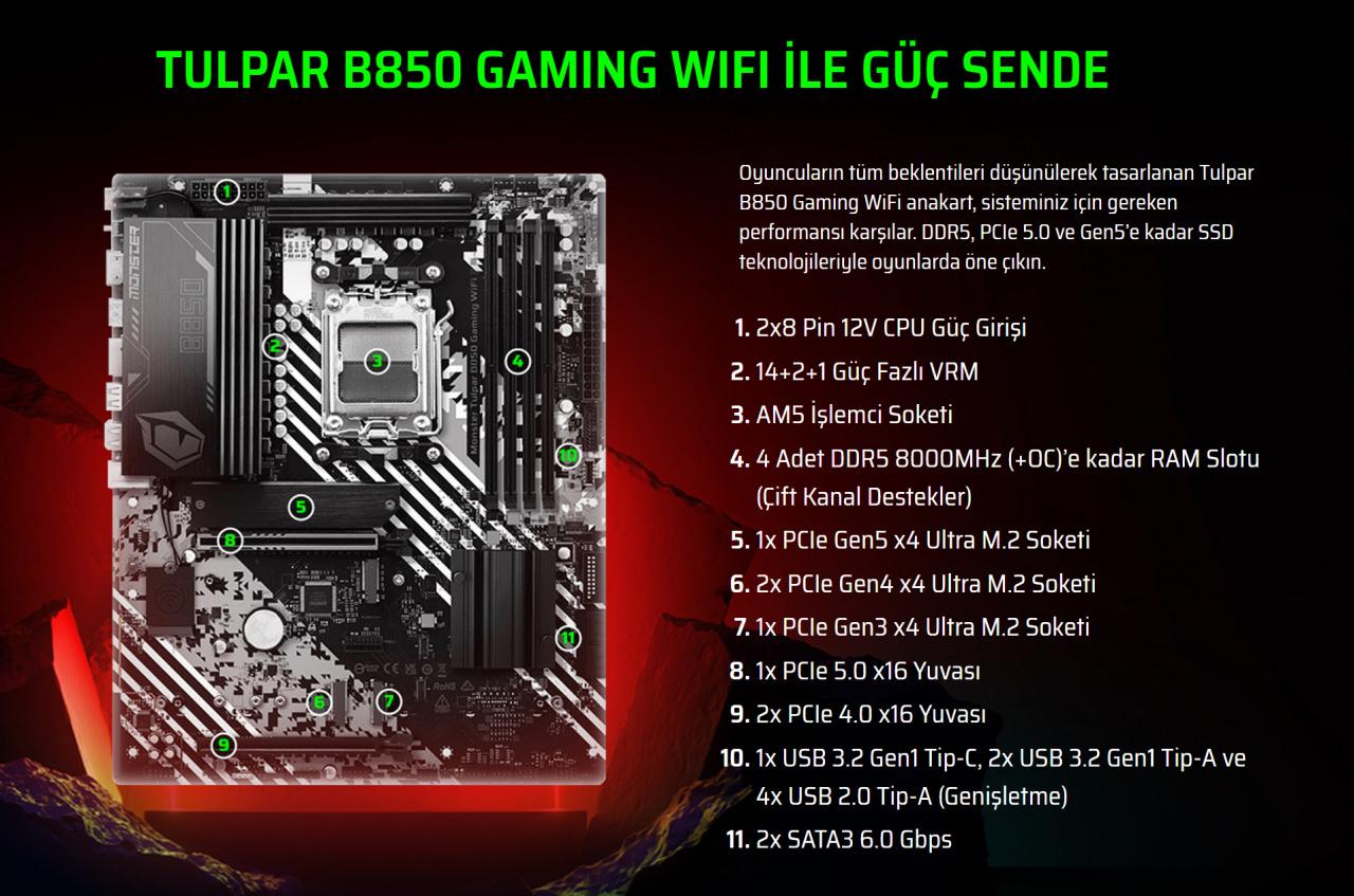 B850 Gaming WiFi anakart; güçlü VRM yapısı, PCIe 5.0 x16 ekran kartı yuvası ve Gen5 M.2 SSD desteğiyle üst seviye donanımlar için sağlam bir temel oluşturuyor.