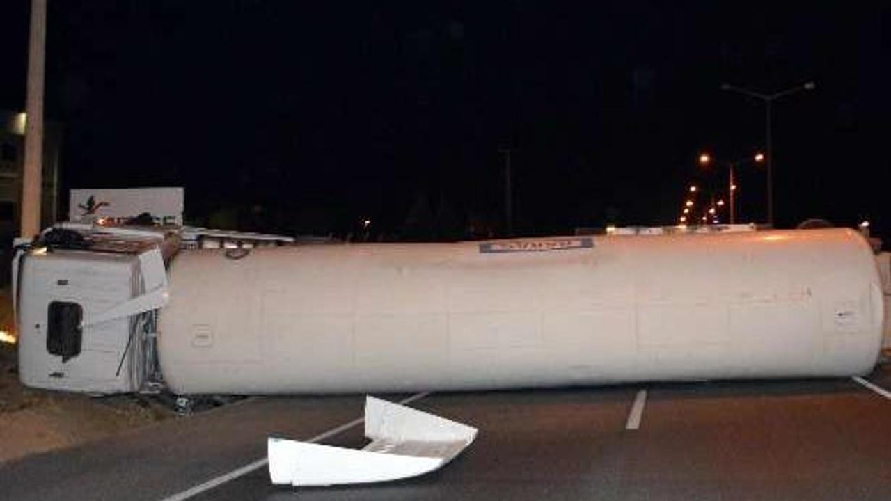 Manisa'nın Turgutlu ilçesinde doğalgaz yüklü tanker devrildi. Kazada 2 kişi yaralanırken, tankerin deposunda 22-23 ton civarında doğalgazın olduğu öğrenildi.