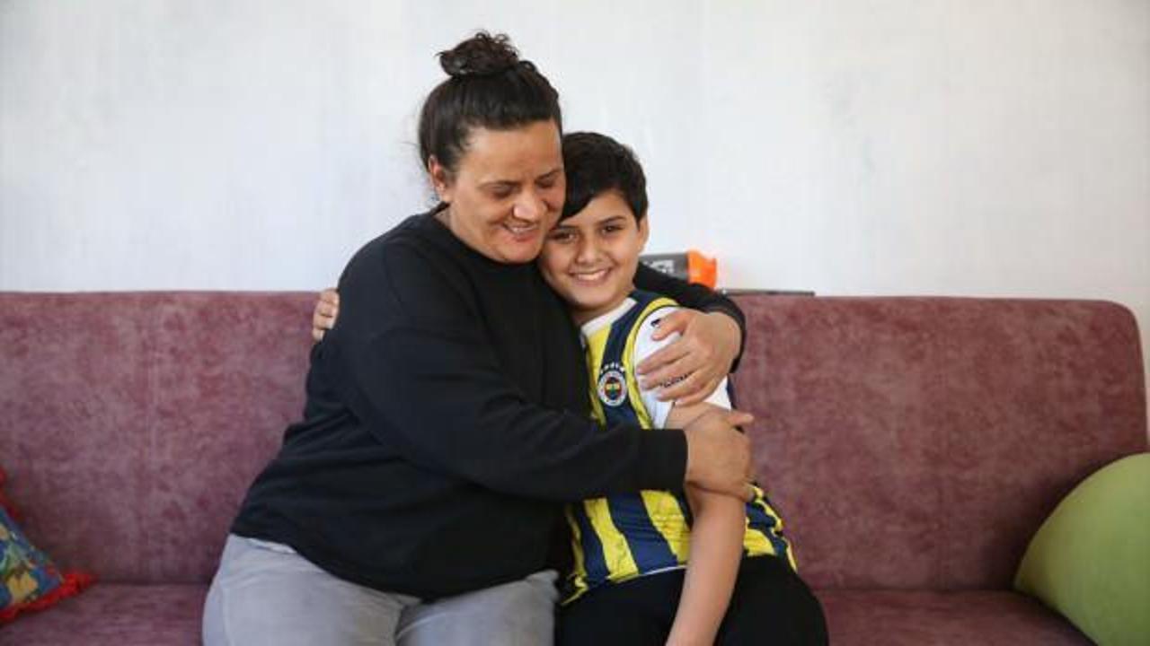 Hatay'da depremde yıkılan apartmanın enkazından afetin 10. saatinde yaralı kurtarılan ve protezle yürümeye başlayan 11 yaşındaki Bülent Çoban, öğretmeninin hediye ettiği imzalı Fenerbahçe formasını giyiyor.