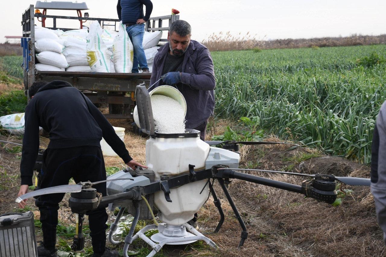 Bu çerçevede Mersin'in Tarsus ilçesinde bulunan 200 dönümlük pırasa tarlasında dron ile gübreleme çalışması gerçekleştirildi.