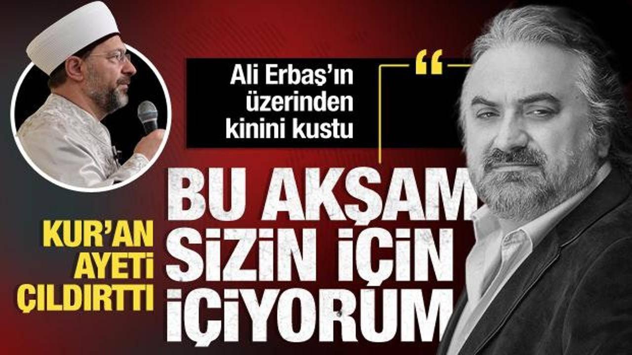 "Atatürk'ün kurduğu Diyanet'in koltuğunu işgal eden zat, insanlığın hizmetine ücretsiz sunulan dini maaşla icra etmek, eğlence ve de turizm alanında çalışan ve bu sektörlerin vergisinden maaş almayı içine sindirmek, ancak sizin gibi bezirgan saltanatı süren kişilere yakışır. Bu akşam maaş ve ödeneklerinize katkı olması için bir kadeh de sizler için içiyorum. Lütfen kabul buyurunuz…"