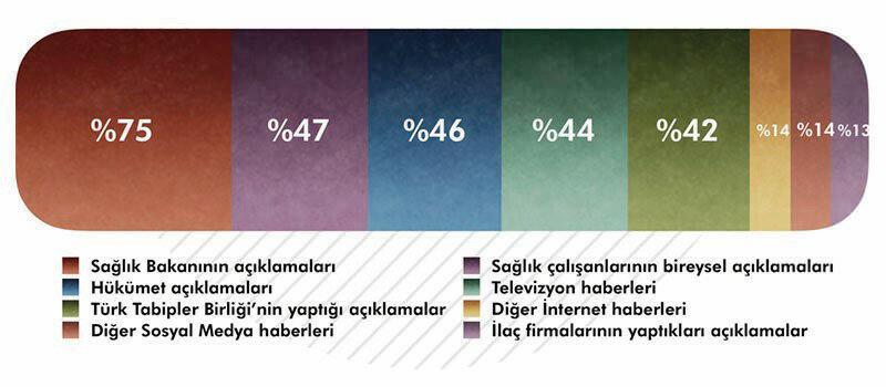 En güvenilir kaynak, bu araştırmada da değişmemiş ve yüzde 75’lik oranla ‘Sağlık Bakanı’nın açıklamaları’ olarak kayda geçmiş… Onu sağlık çalışanlarının açıklamaları, hükümet açıklamaları, TV haberleri izliyor…