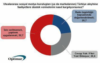 Optimar Araştırma’nın başkanı Hilmi Daşdemir, yaptıkları bir çalışmanın sonuçlarını göndermiş… Yabancı sosyal medya şirketlerinin Türkiye aleyhine faaliyetlerine “İzin verilmemeli” diyenlerin oranı yüzde 52,7…