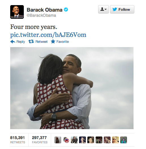 Obama'nın 'Four more years" (dört yıl daha) diyerek Twitter'dan seçim zaferini müjdelediği mesaj ise tam anlamıyla bir dünya sosyal medya fenomenine dönüştü. Obama'nın eşine sarıldığı ve gülümsediği bir fotoğrafı gösteren mesaj bugüne kadar 800 binden fazla kişi tarafından retweet edildi. Böylece Twitter tarihinin en çok paylaşılan mesajı haline gelen bu fotoğraf Facebook'ta 3 milyondan fazla beğeni aldı ve 400 binden fazla kişi tarafından paylaşıldı.