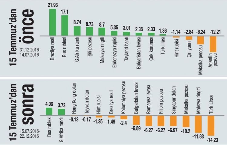 İkinci grafiğe dikkatlice bakarsanız, TL'nin 15 Temmuz-22 Aralık tarihleri arasında dolar karşısında yüzde 14.23 eridiğini görürsünüz. En çok değer kaybeden ikinci para birimi yüzde 11.83 ile Malezya Ringiti, üçüncü para birimi ise yüzde 10.20 ile Meksika Pesosu. Değer kazananlar ise Rus Rublesi ve Güney Afrika Randı.