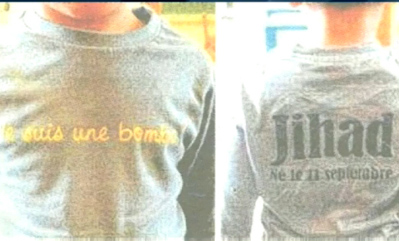 Fransa'da bir anne 3 yaşında ki çocuğuna üstünde “Jihad né le 11 septembre » ve “je suis une bombe” yazan bir T-Shirt ile okula göndermişti.