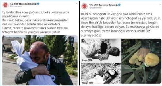 Diğerinde de şu satırlar yer aldı: "Ey farklı dilleri konuştuğumuz, farklı coğrafyalarda yaşadığımız insanlık... Bu minik bebek, gece uykusundayken Ermenistan ordusu tarafından balistik füze ile katledildi. Dilimiz, dinimiz, ülkelerimiz farklı olabilir fakat bu fotoğraf hepimizin yüreğini yakmaya yeter!"