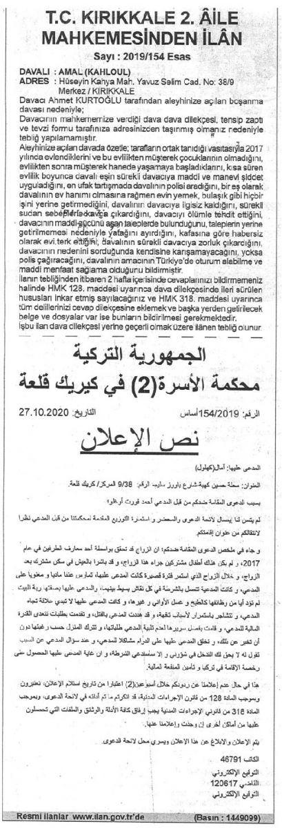Kadının Türkiye'de oturum almak için kendisini kullandığını söylemiş. Mahkeme hem davalının hem davacının lisanında 'kadın cevap vermezse iddiaları kabul etmiş sayılacağına' yönelik ilan yayınlanmasına hükmetmiş. İki dil dediğimiz Türkçe ve Arapça. Alt alta iki ilan. Metin aynı metin.