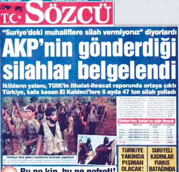 17 Aralık’tan bir gün önce, “AKP’nin gönderdiği silahlar belgelendi” diye manşet atmışlardı. Üst başlığında “Suriye’deki muhaliflere silah vermiyoruz diyorlardı” yazıyor, altındaki spotunda da “İktidarın yalanı TÜİK ihracat-ithalat raporunda ortaya çıktı. Türkiye kafa kesen El-Kaideci’lere 6 ayda 47 ton silah yolladı” ifadesi yer alıyordu.