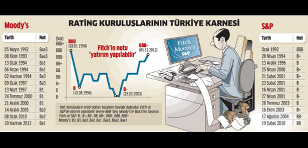 Kredi derecelendirme kuruluşu Fitch Türkiye'nin BB+ olan kredi notunu yükselterek BBB(-)'ye yükseltti... Yani Fitch döviz cinsinden hazine borçlanma kağıtlarının yatırım yapılabilir olduğunu ve risklerinin az olduğunu teyit etti. Karar piyasaları olumlu etkiledi aslında bir süredir "sıfırcı hocalara" küs olan iş dünyasının bir nebze gönlünü aldı...