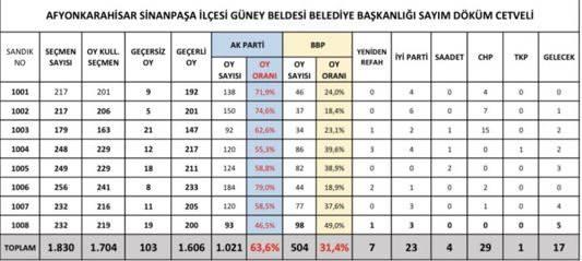 Pazar günü Afyonkarahisar’ın Sinanpaşa ilçesinin Güney beldesinde belediye başkanlığı için seçim vardı. Seçimi MHP’nin de desteklediği AK Parti adayı Erol Karabacak %63.9 oyla kazandı. Resmî olmayan sonuçlara göre partiler arasındaki oy dağılımı aşağıdaki gibi gerçekleşti.