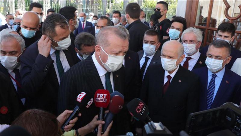 Cumhurbaşkanı Erdoğan, MHP Genel Başkanı Devlet Bahçeli ile aynı araçla gelerek, ziyaret ettiği Fatih’in türbesinin girişinde basın mensuplarının sorularını cevapladı. Erdoğan "Bugün, Ayasofya-i Kebir Cami-i Şerifi'nin açılışında, 350 bin kişi cuma namazına iştirak etmiş" dedi.