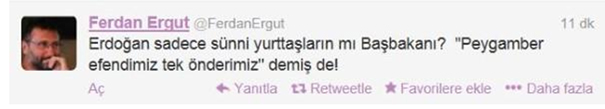 Yukarıda tweetini kopyalayıp gösterdiğimiz kişi, "Erdoğan sadece Müslüman yurttaşların mı Başbakanı?" diye sorsaydı, buna hiç kimsenin itirazı olmazdı. Ama öyle yapmıyor, bir cehalet sergiliyor, "Erdoğan sadece sünnî yurttaşların mı Başbakanı?" sorusuyla. Gerekçesi de, Başbakan Erdoğan'ın "Peygamber efendimiz tek önderimiz" demiş olması.