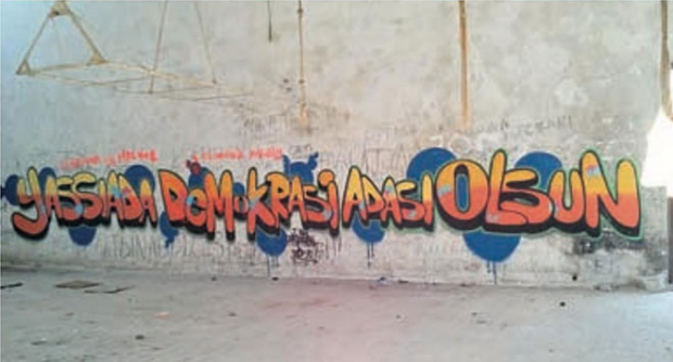 Yassıada duruşmalarının yapıldığı salon... Yeni imardan önceki son fotoğraf... Duvardaki yazıyı yazan el, arzusuna kavuşmuş bulunuyor...