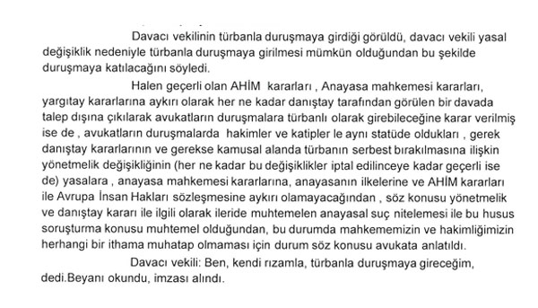 Avukatların başı örtülü duruşmalara girmesini engelleyen yönetmeliğin yürütmesinin Danıştay tarafından durdurulması kararı aylar önce yürülüğe girmiş. Sadece avukatlar değil bütün memurların başı açık olma zorunluluğunu düzenleyen 12 Eylül kalıntısı yönetmeliğin ilgili bölümü yürürlükten kaldırılmış, Resmi Gazete'de yayınlanmış. Evrensel hukuk, Anayasa ve kanunların öngördüğü biçimde başı açık, başı kapalı ayrımına son verilmiş olduğu bir dönemde bir hakim hukuku tanımadığını ilan ediyor ve bunu tutanaklara geçiriyor.