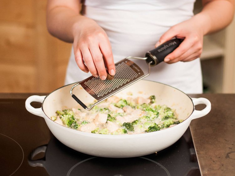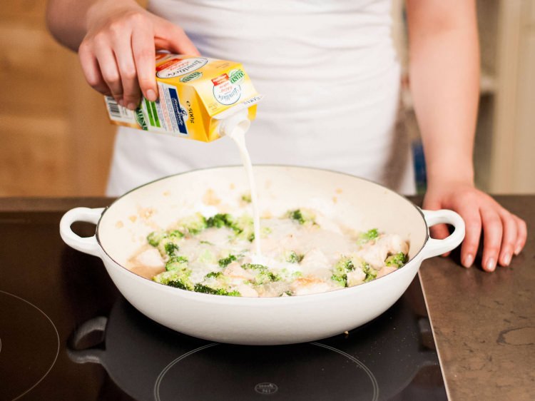 Tavuk ve brokoli ile birleşen son dokunuşlardan birisi olan kremayı da ekleyip 5 -6 dakika yavaşça karıştırıyoruz.