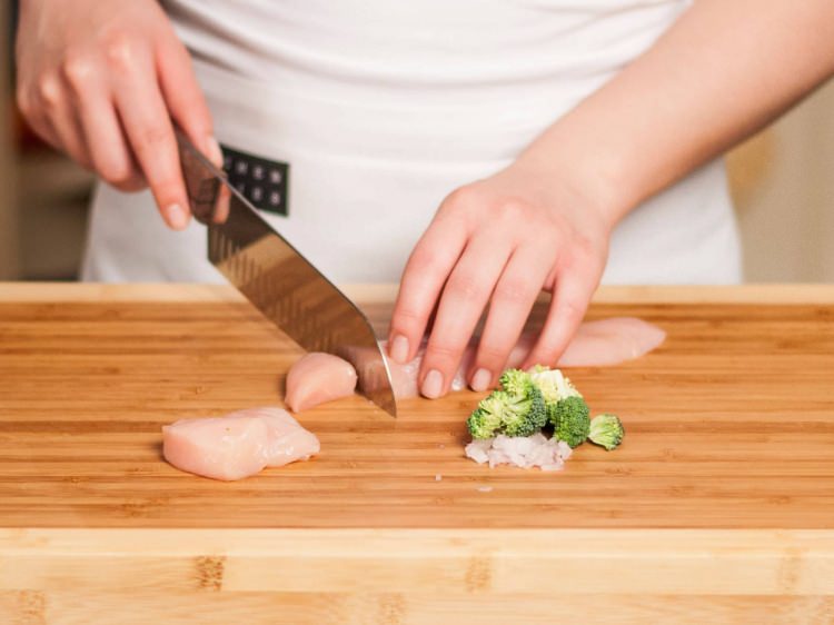 Soğan, brokoli ve tavuk göğsünü küp şeklinde doğruyoruz.