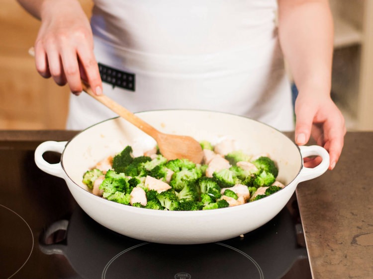 Ardından doğradığınız tavukları ekleyin. Tavuklar hafif kızana kadar karıştırın. Haşlanan brokolileri de ekleyebiliriz.
