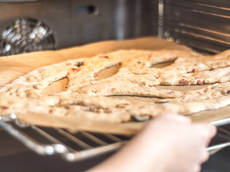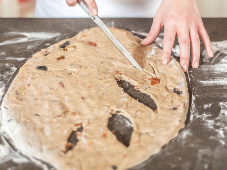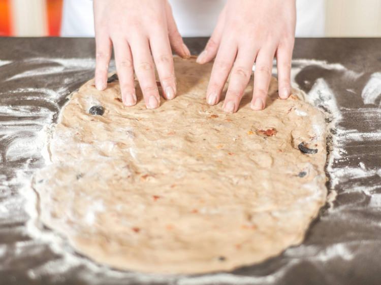Mikserde un, su, tuz, maya, zeytinyağı, çavdar unu ve biberiyeyi karıştırıp hamur yapalım. Kurutulmuş domatesi ince şerit halinde keselim.