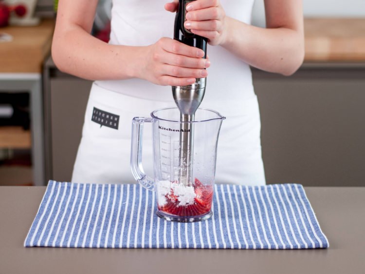 Blenderde çilek, pudra şekeri, nane ve limon suyunu karıştırarak püre kıvamına getirelim.