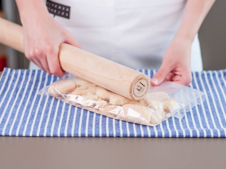 Kedi dili bisküvilerini bir torbaya koyup oklava ile ezelim.