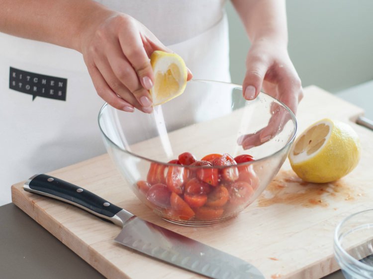 Geniş bir kapta domates, zeytinyağı, tuz, karabiber ve limon suyunu birleştirelim.