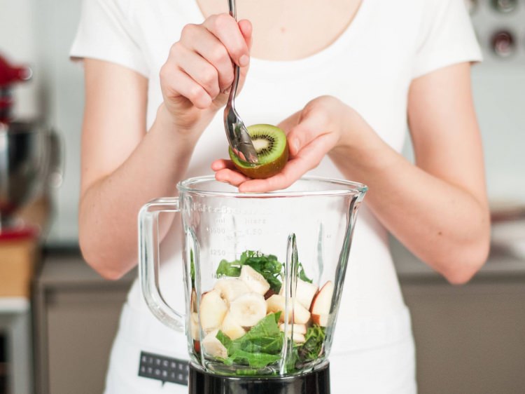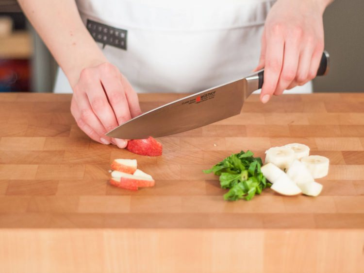 Ispanakları yıkayalım. Ardından elma, armut, ıspanak ve muzu doğrayalım. Malzemeleri blendere ekleyelim.