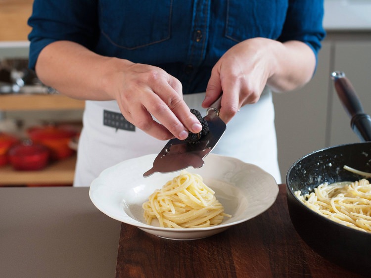 Servis tabağına aldığımız makarnanın üzerine siyah trüf mantarını rendeleyip servis edelim.