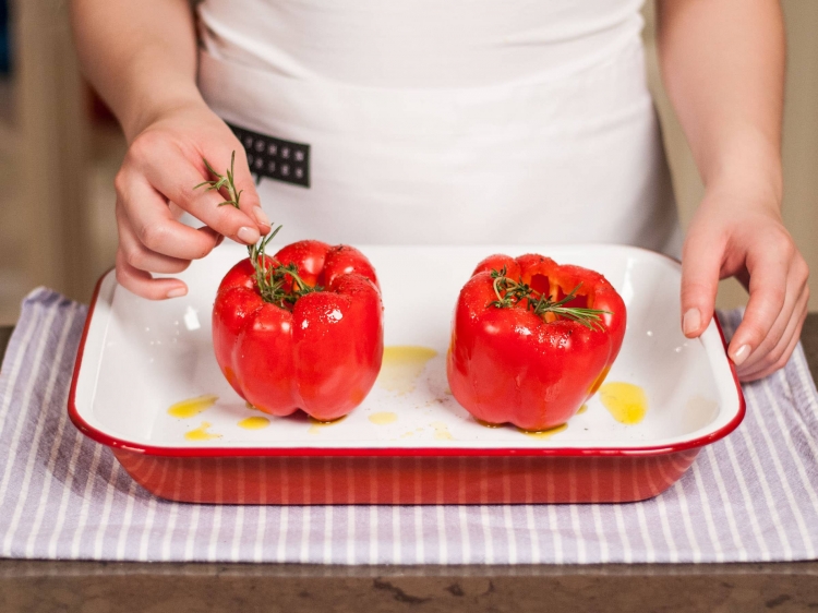 Biberin içerisine kekik, biberiye, sarımsak koyalım. Tuz ve zeytinyağı gezdirelim.