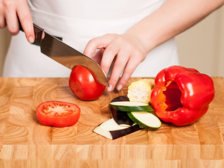 Kabak, patlıcan ve domatesleri kalın julyen şeklinde keselim. Kırmızı biberin çekirdeğini çıkaralım.
