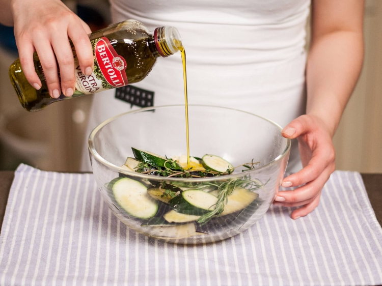 Bir kaba patlıcan ve kabak dilimlerini koyalım. Doğranmış biberiye, kekik ilave edip, tuz, ezilmiş sarımsak ve zeytinyağı ile marine edelim.