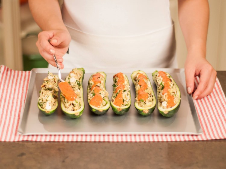 Bir kapta krema ve kırmızı biberi karıştıralım. Kabakların üzerine gezdirelim ve fırında 10 dk pişirelim.