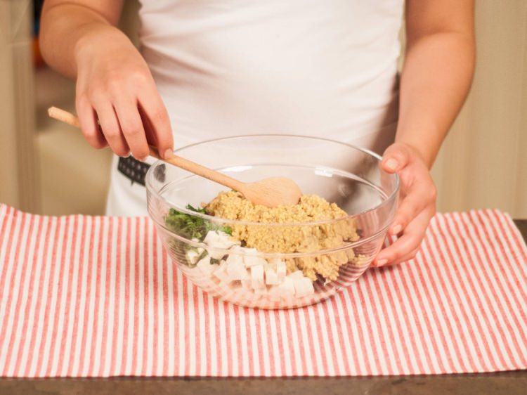 Bir kapta tofu, maydanoz, kabak içi, çam fıstığı, kuru üzüm ve mısırı ekleyelim. İyice karıştıralım ve tuz, karabiber ekleyelim.