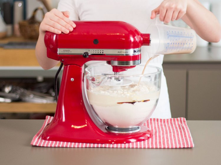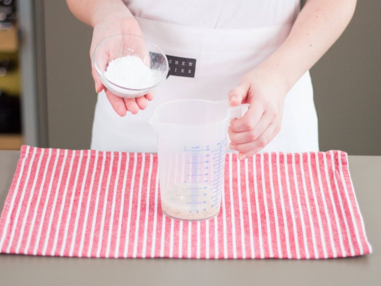 Bir kapta pudra şekeri 40 gram maya ve 40 gram suyu karıştıralım. Mayanın iyice köpürmesi için yarım saat bekleyelim.