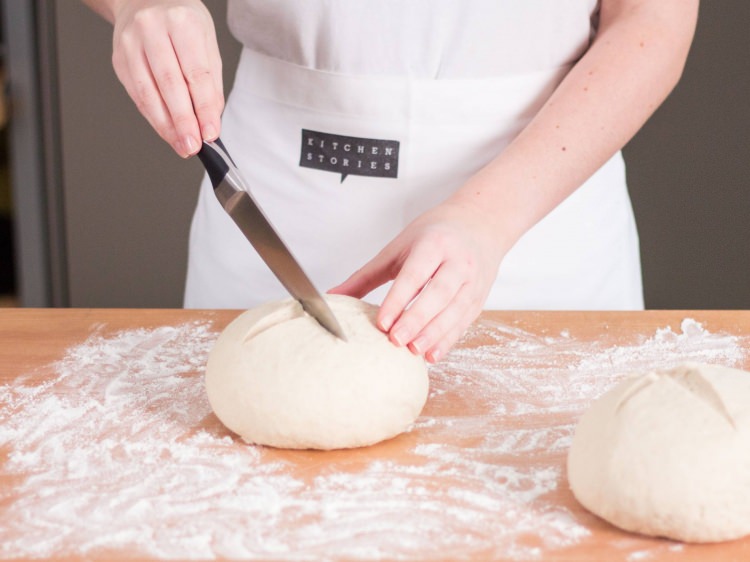 Hamuru iki eşit parçaya bölerek pürüzsüz kıvama gelene kadar yoğurarak şekil verelim. Hamurun üzerine bıçak ile kesikler atarak tepsiye dizelim ve 15 dakika daha bekletelim. Önceden ısıtılmış 220 derece fırında 30-40 dakika pişirelim.