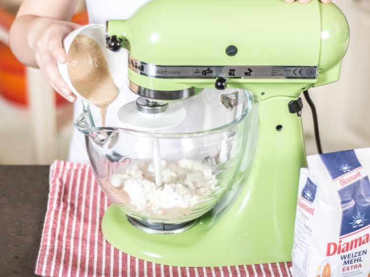 Büyük bir kaseye un, su, kuru ve ekşi mayayı koyarak yoğuralım.