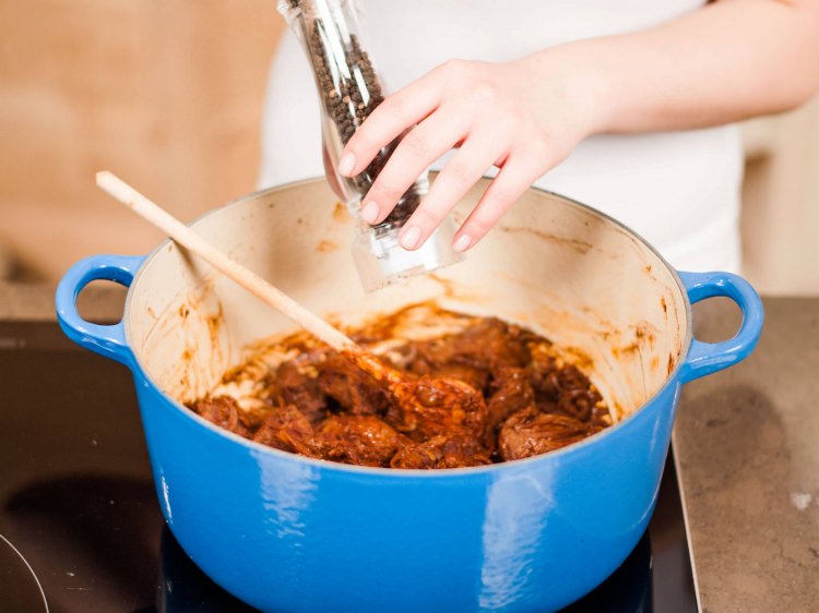 Soğan, sarımsak ve salça ekleyip karıştıralım. Kimyon, tuz, karabiber,defne yaprağı, hindistan cevizi ve kırmızı biber ekleyelim.