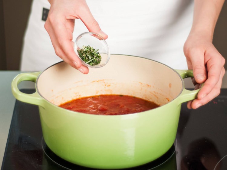 Domates sosuna tuz, biber, taze kekik, kekik ve biberiye ekleyelim. Yaklaşık olarak 10-15 dk kaynatalım.