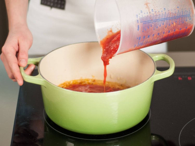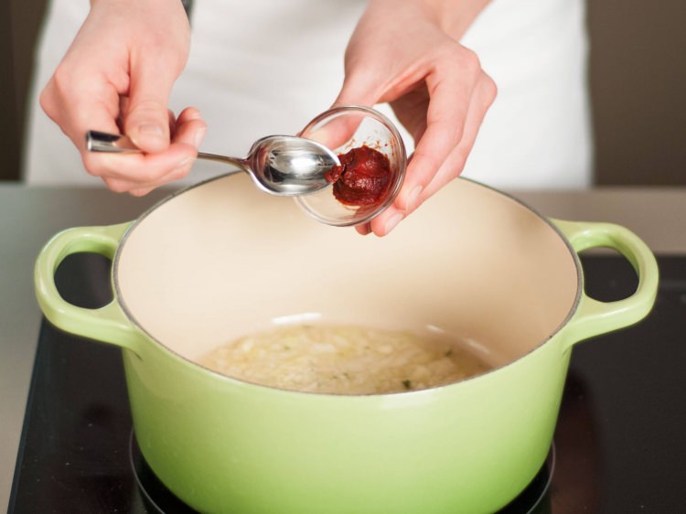 Büyük bir tencerede zeytinyağını ısıtalım. Soğan ve sarımsağı soteleyelim. Domates salçasını ilave edip 1-2 dk soteleyelim.
