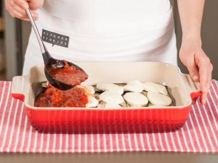 Fırın kabına patlıcan ve mozerallayı dizelim. Üzerine domatesli sosu dökelim.