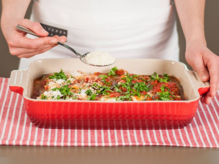 Fırını 180 derecede ısıtalım. Rendelenmiş parmesan ve fesleğeni koyup fırında 20-25 dk pişirelim.