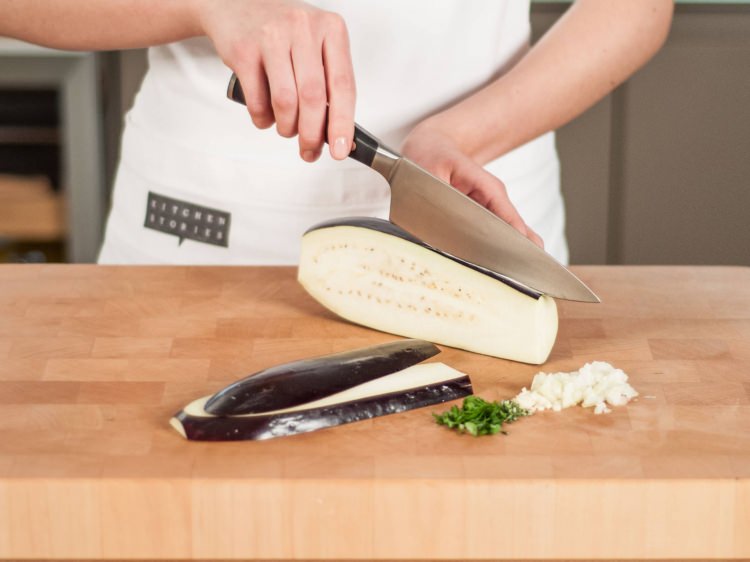Soğan ve sarımsağı ince doğrayalım. Patlıcanı uzunlamasına keselim. Kekik, biberiye ve fesleğeni doğrayalım.
