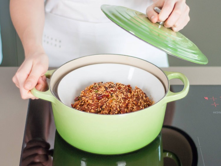 Etli karışımla pilav karışımını buharlı bir tencerede, pirinç ve etler yumuşayana kadar 1-2 saat pişirelim.