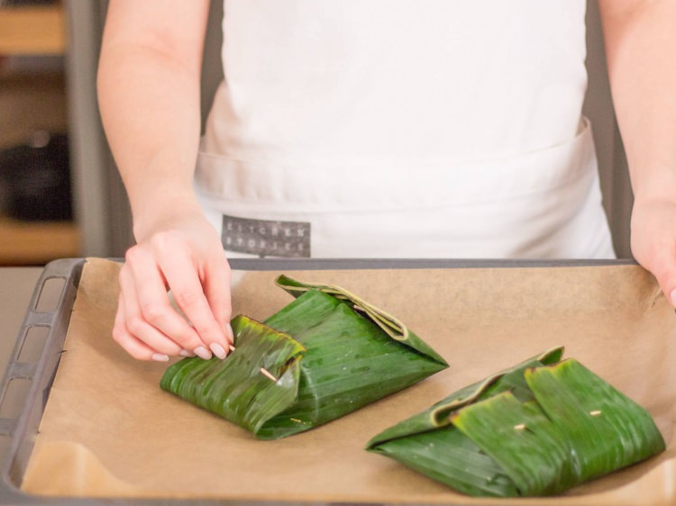 Muz yapraklarını katlayalım kürdan ile kenarlarını birleştirelim. Fırında 30 dk pişirelim.