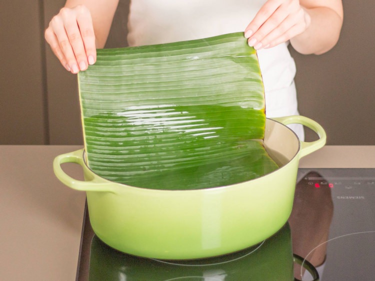 Büyük bir tencerede muz yapraklarını 1-2 dk pişirelim.