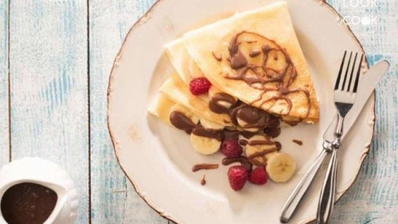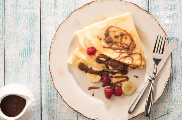 Piştikten sonra katlayalım. Eritilmiş çikolata, ahududu ve muzla servis edelim.
